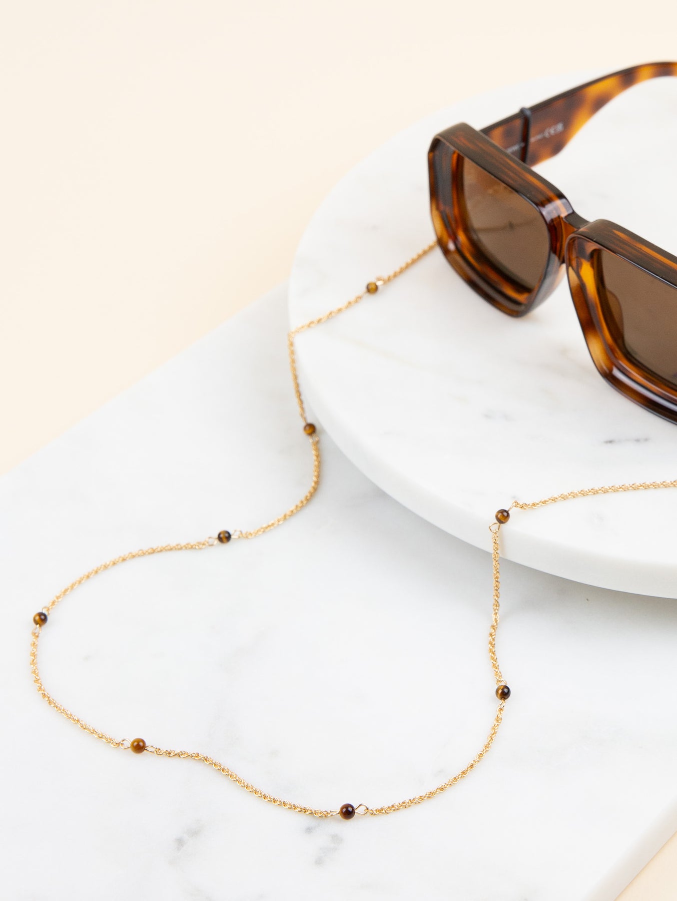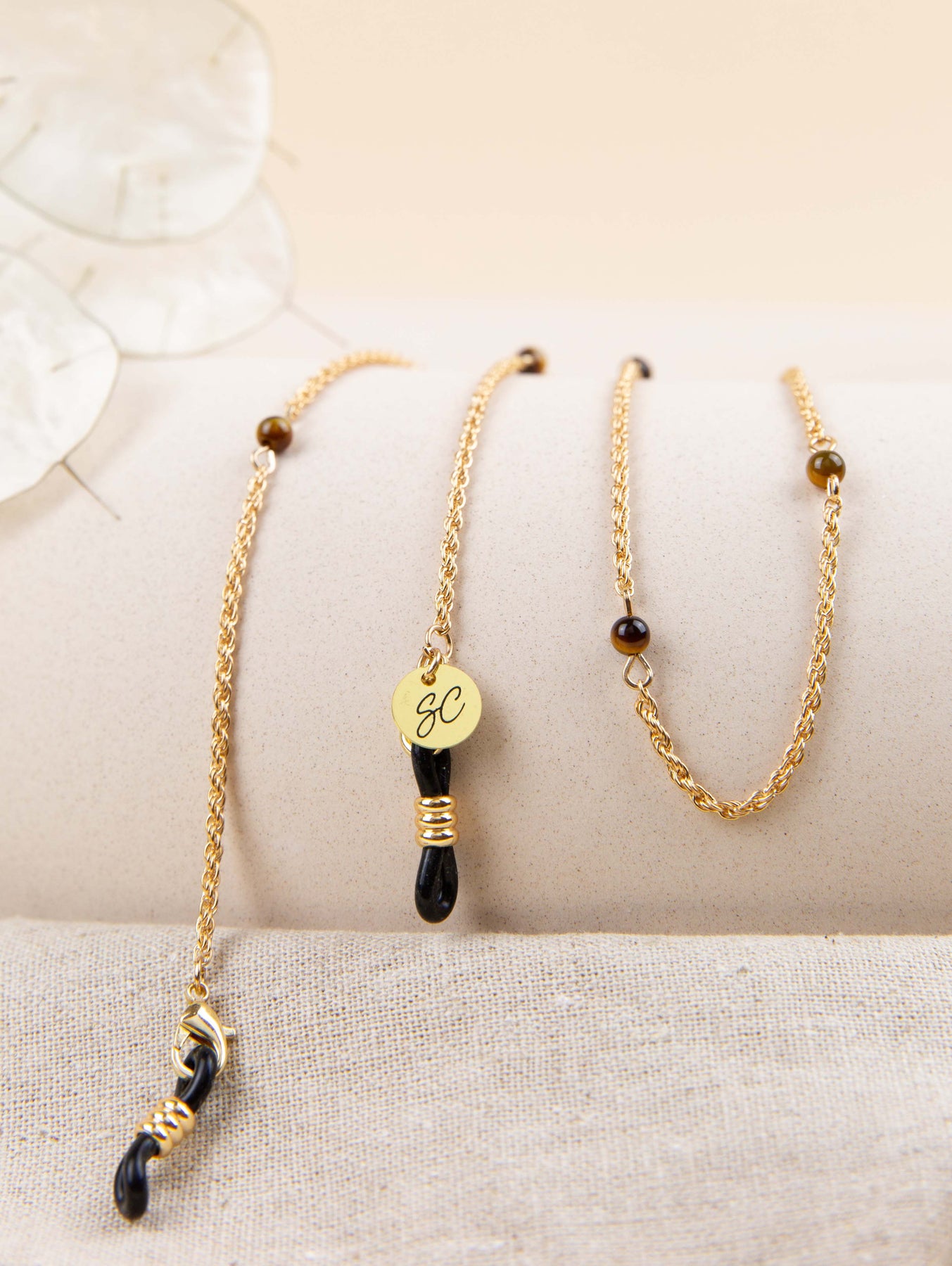 Embrace your active lifestyle with the Sunny Cord chain Tess, perfect for keeping up with your daily hustle and bustle. The versatile green, beige or tiger eye colour of this glasses chain pairs well with any outfit, making it a must-have accessory in your collection. This accessory is built to last, ensuring you will enjoy it for years to come. Can be worn not only as a sunglass chain but also as a bracelet or necklace.