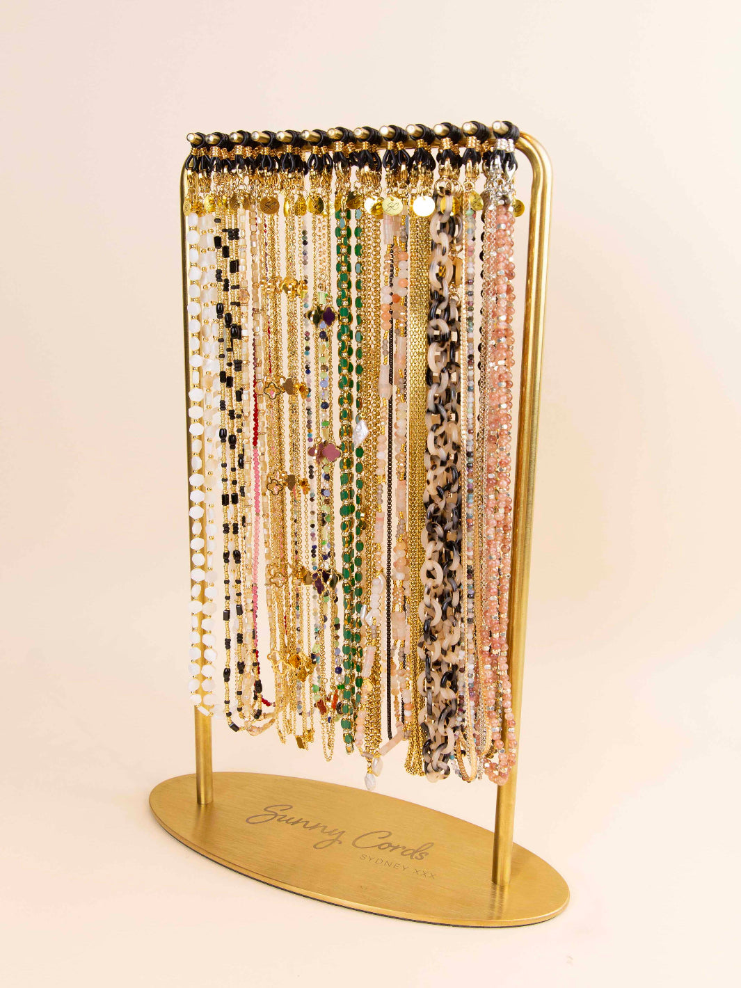 This Sunny Cords display stand is a new design that shows elegance. Made from gold-colored metal, it offers a stylish way to showcase your eyewear chains.