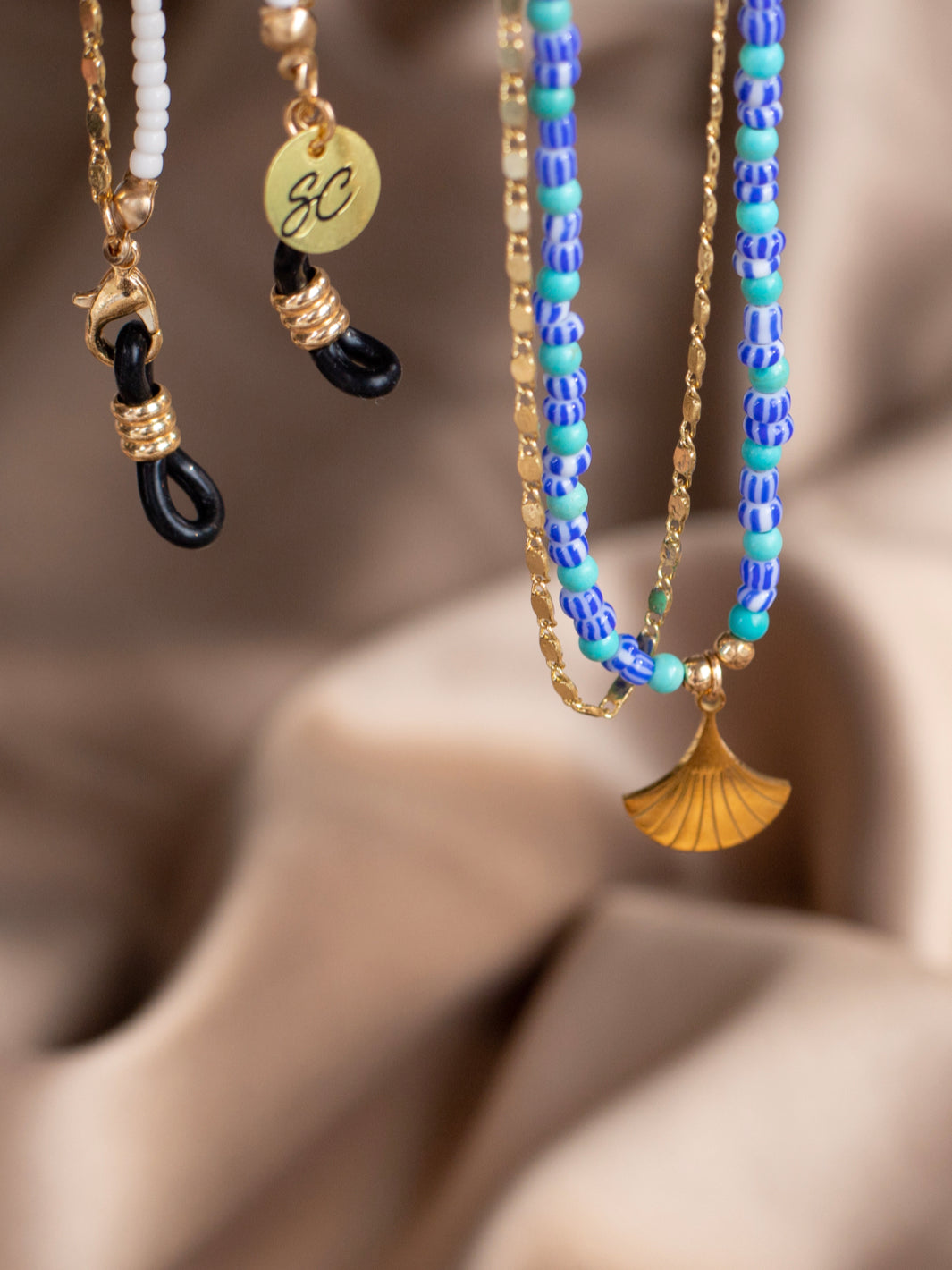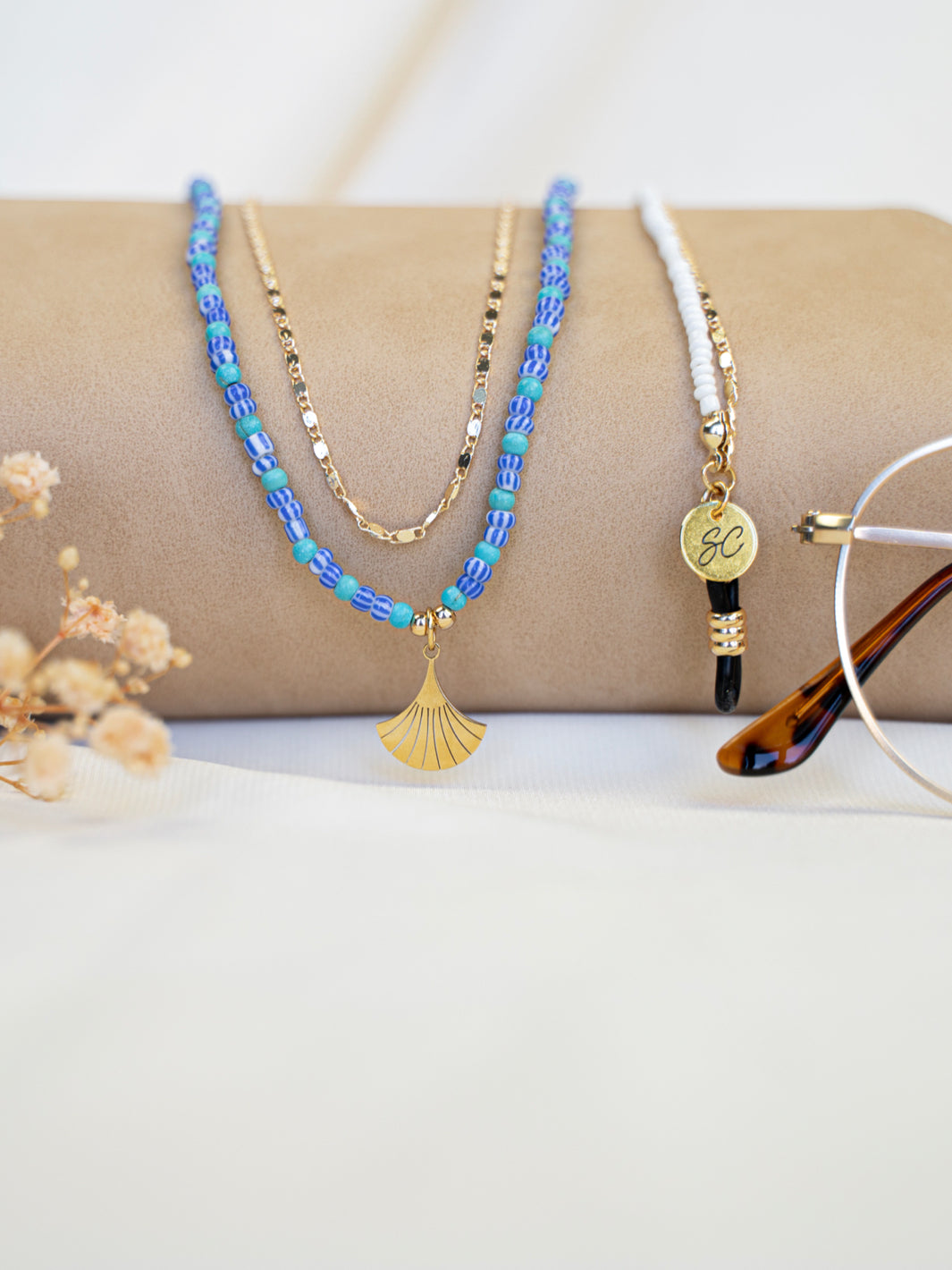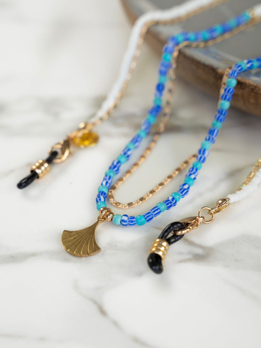 This beautiful gold urban style glasses chain adds flair to your outfit. A gold classy chain combined with summerly blue-white beads! This sunglass chain design that will hold your sunnies right where you want them to be. Your best friend will definitely be a fan of this sunglass chain!