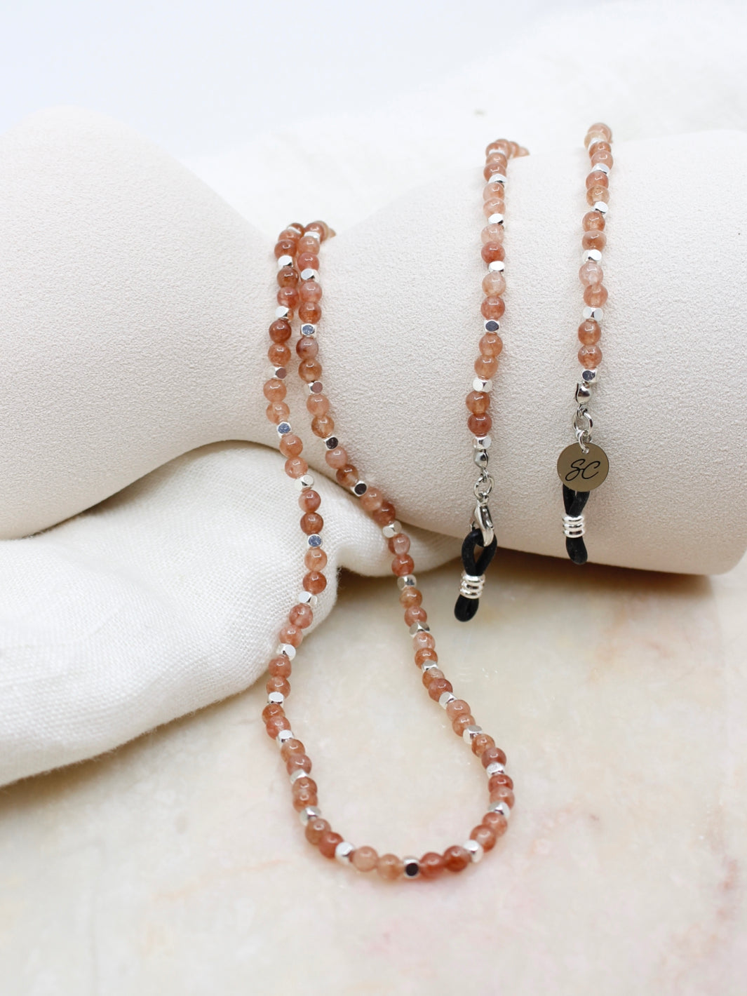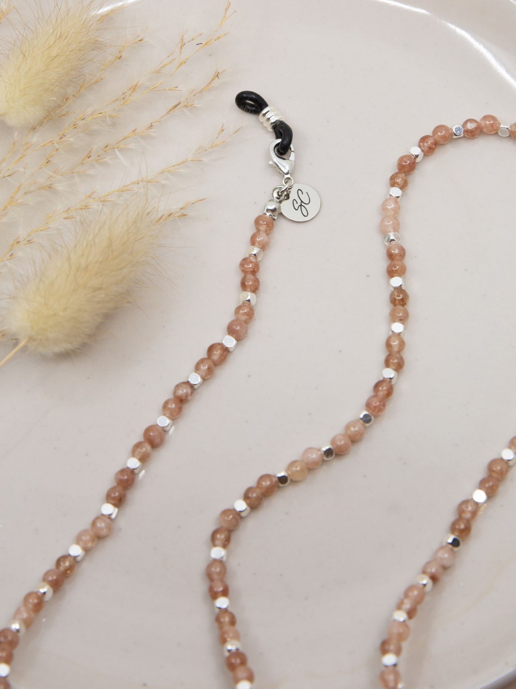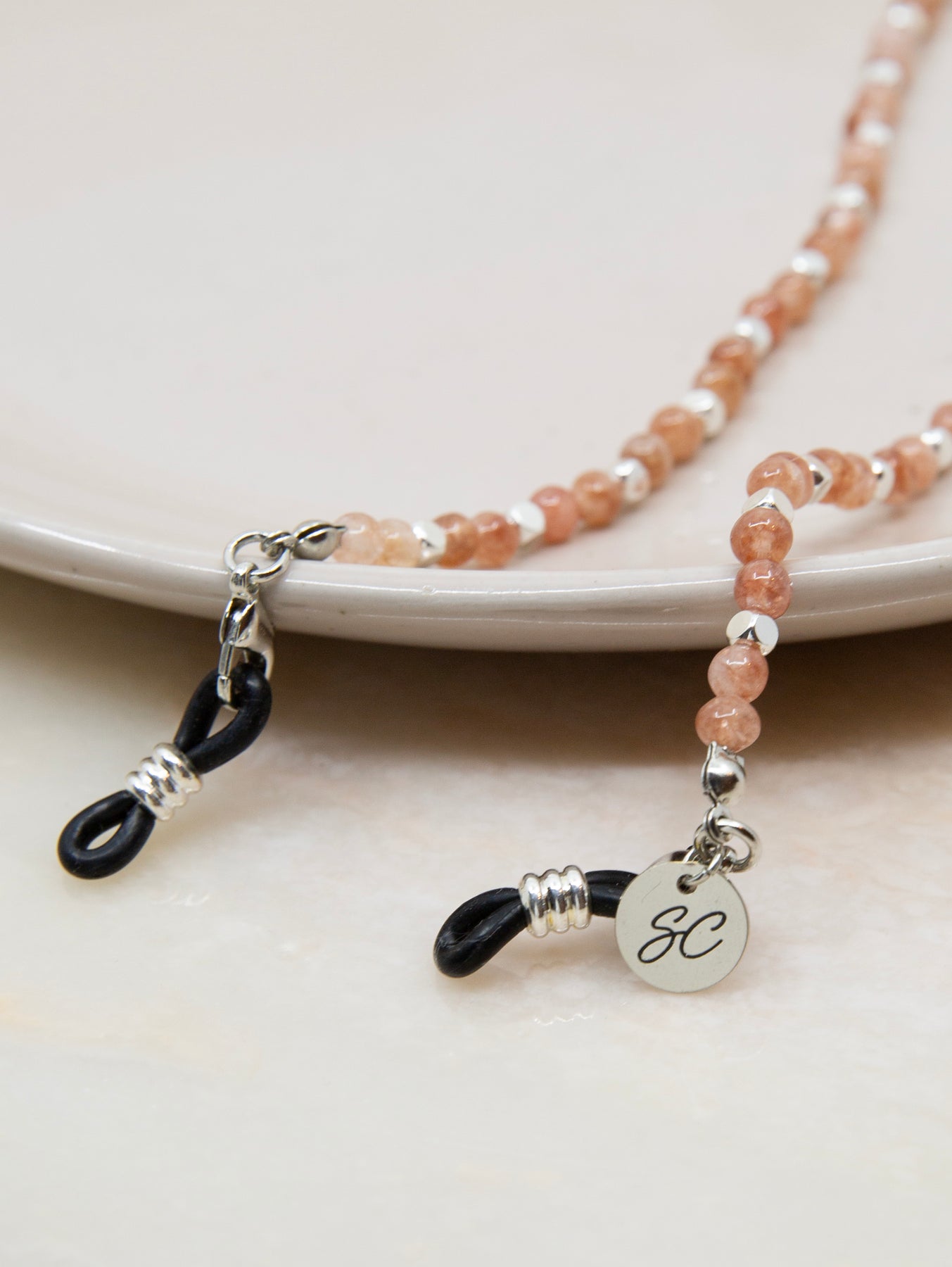 This beautiful silver urban style sunglass cord adds flair to your outfit. Silver combined with peachy beads! This sunglass chain design that will hold your sunnies right where you want them to be. Your best friend will definitely be a fan of this sunglass chain, we definitely are!