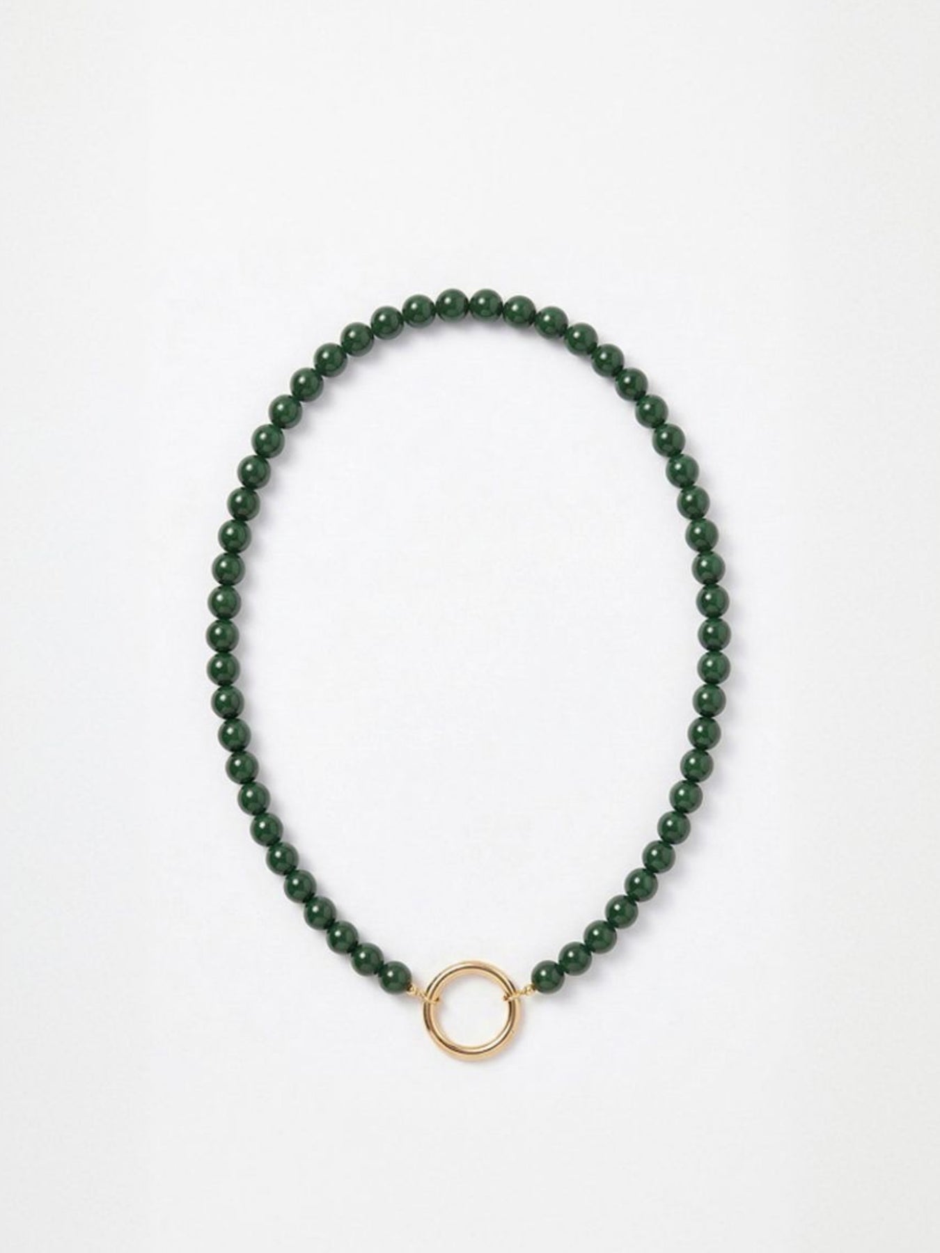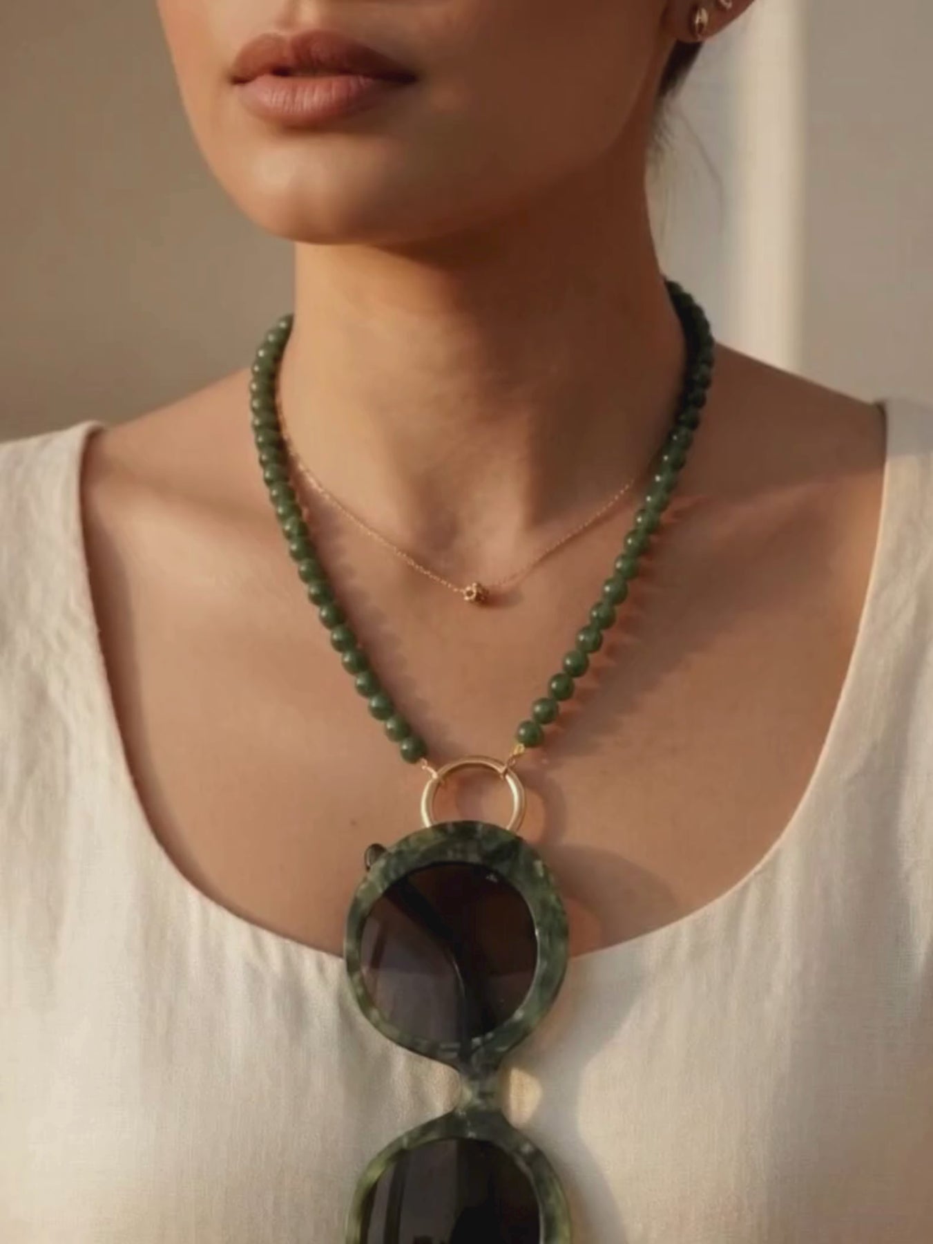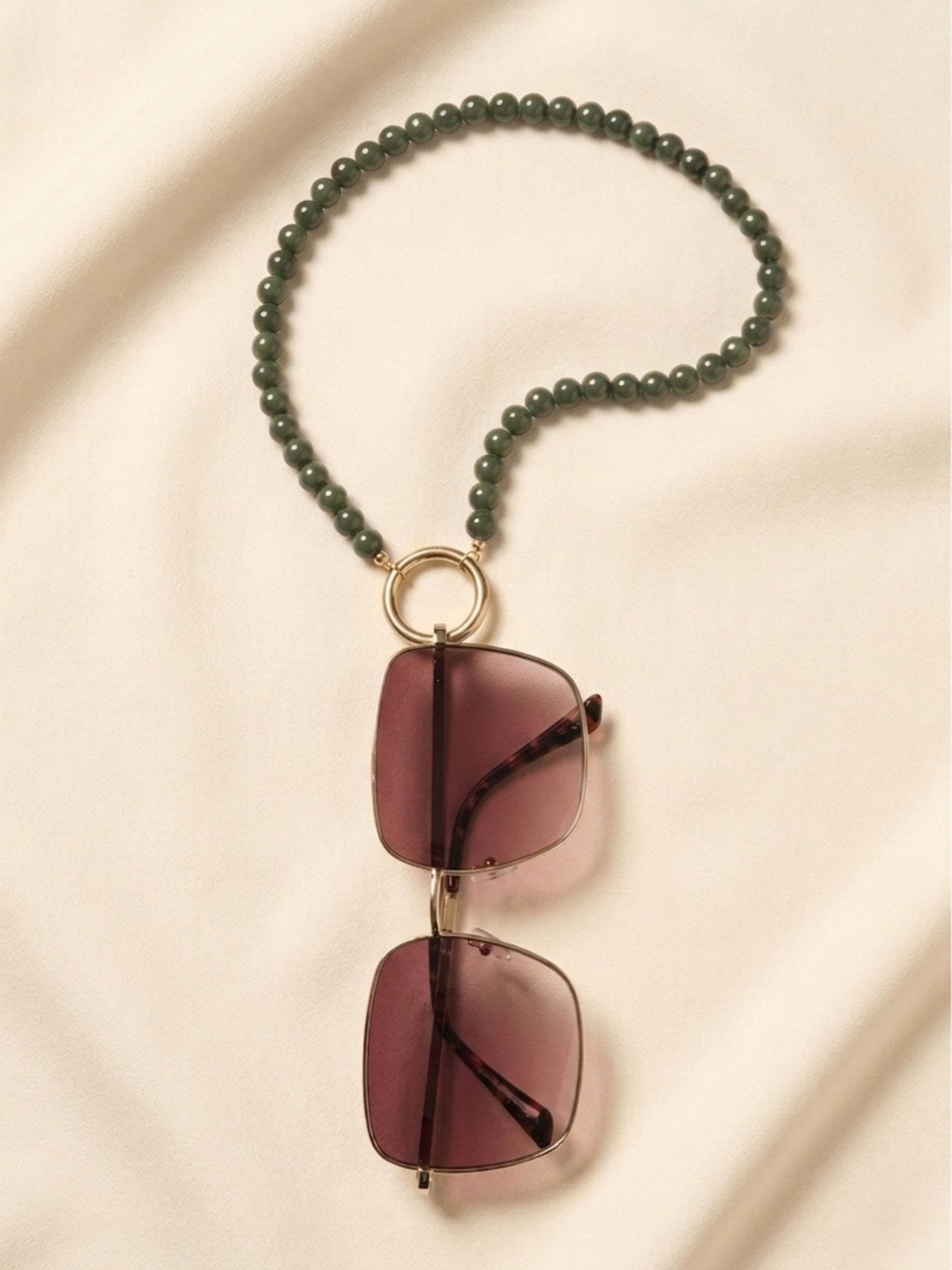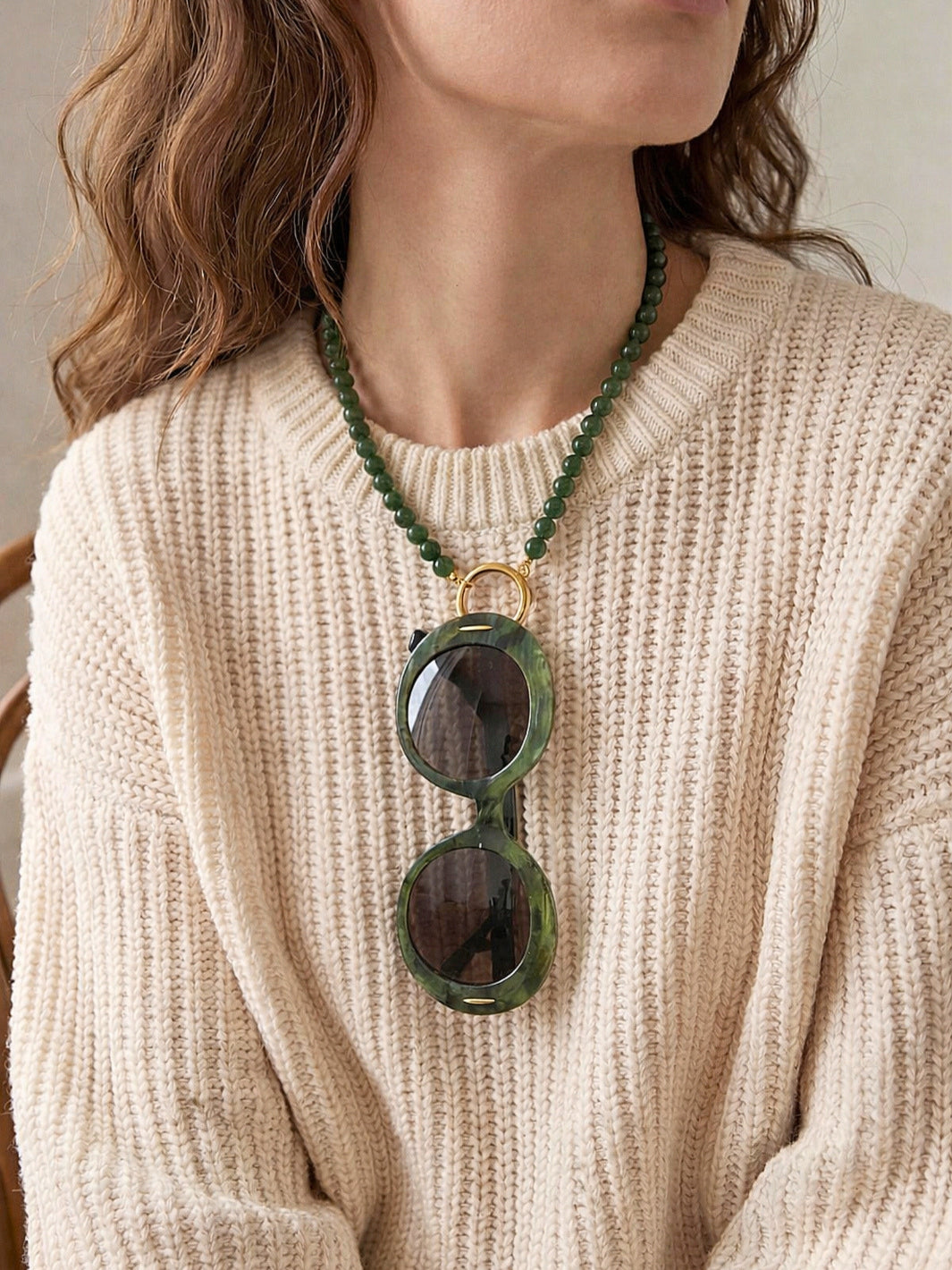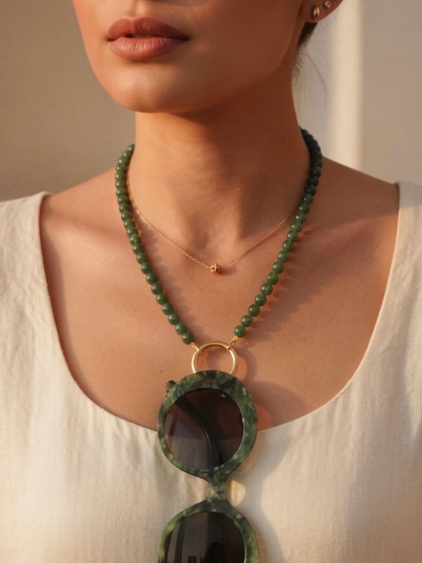 Add a hint of green serenity with the Ceramico Verde Eyewear Necklace. Designed with soft green ceramic beads and a gold-plated ring, it combines functionality with organic charm. The 18 mm ring ensures a perfect fit for nearly all eyewear styles.