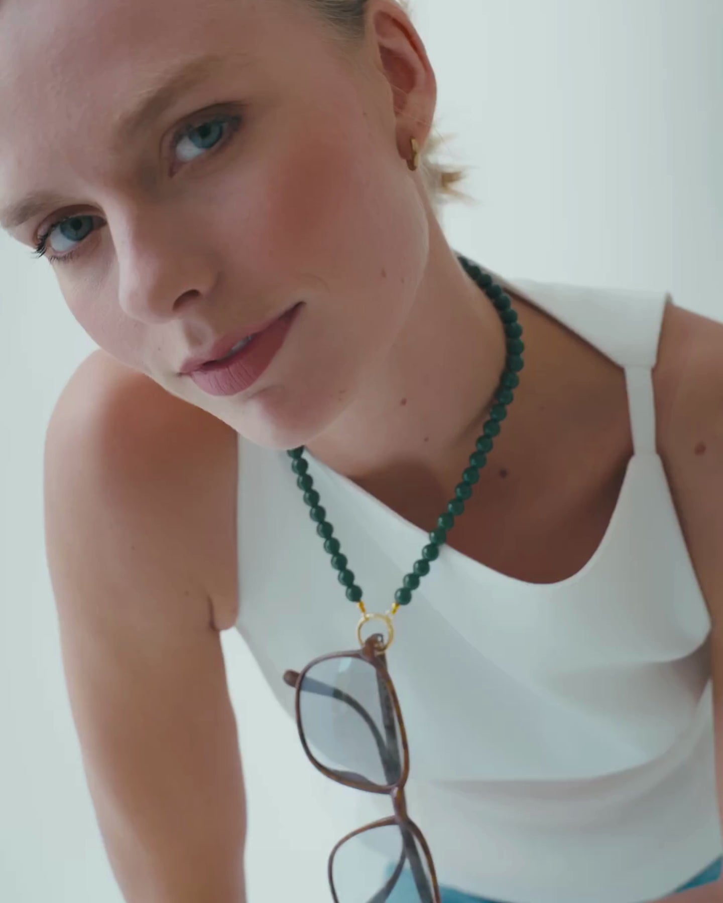 Add a hint of green serenity with the Ceramico Verde Eyewear Necklace. Designed with soft green ceramic beads and a gold-plated ring, it combines functionality with organic charm. The 18 mm ring ensures a perfect fit for nearly all eyewear styles.