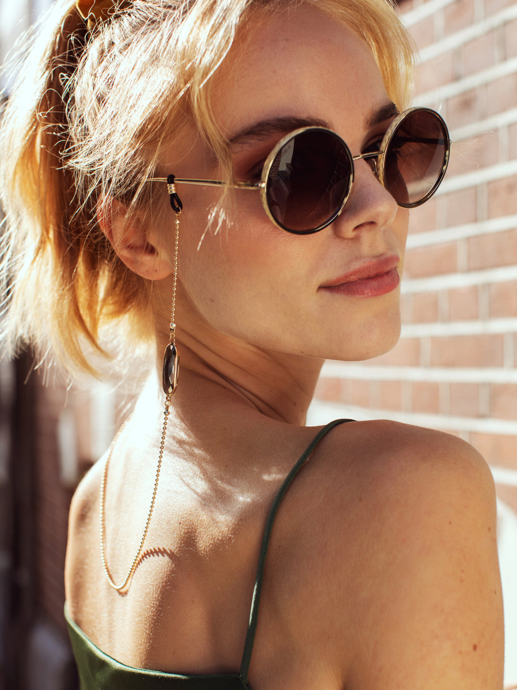 This alluring gold or silver sunglasses chain is the ultimate in versatility, style and beauty… Featuring a bold baguette-shaped crystal stone and a circle charm that come in a variety of shades. This sunglass cord is sure to add flavour and sophistication to even the simplest of outfits. Are you more of a silver girl? Check out the silver variants here!