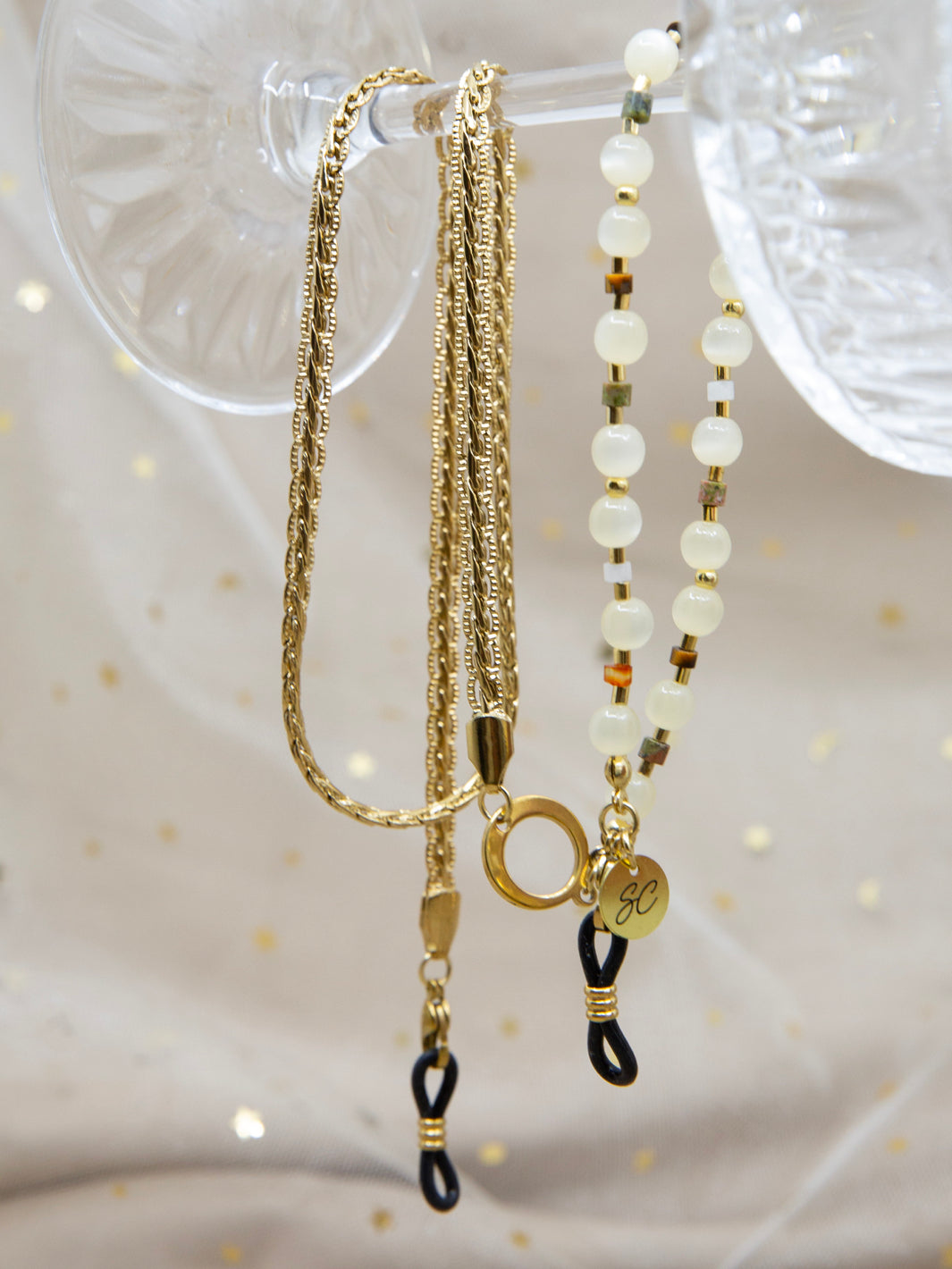 Take a step into the magical world of Maeve, a sparkling sunglass chain made using luxe super Polaris beads and pearls in combination with a braided golden chain. Maeve means ‘magical’ and that is exactly the vibe this sunglass chain radiates. The sparkling and elegant design has been combined with a variating color pallet of luxurious beads, providing this piece of jewelry having with a unique and stylish appearance. Will you go for the multi color variant or is your favorite the one with beads in natural beige color?
