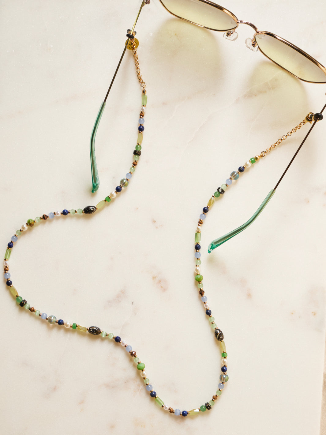 The Stella is our colourful glasses chain that has been defined by a small string of golden chain on both ends. This Sunny Cord has been designed using different types of colourful beads and stones, alternated by a subtle golden pearl. We are such a fan of this design that we designed it in two different colours. Are you opting for the brown one with a touch of pink? Or do the turquoise colours suit better on your (sun)glasses?