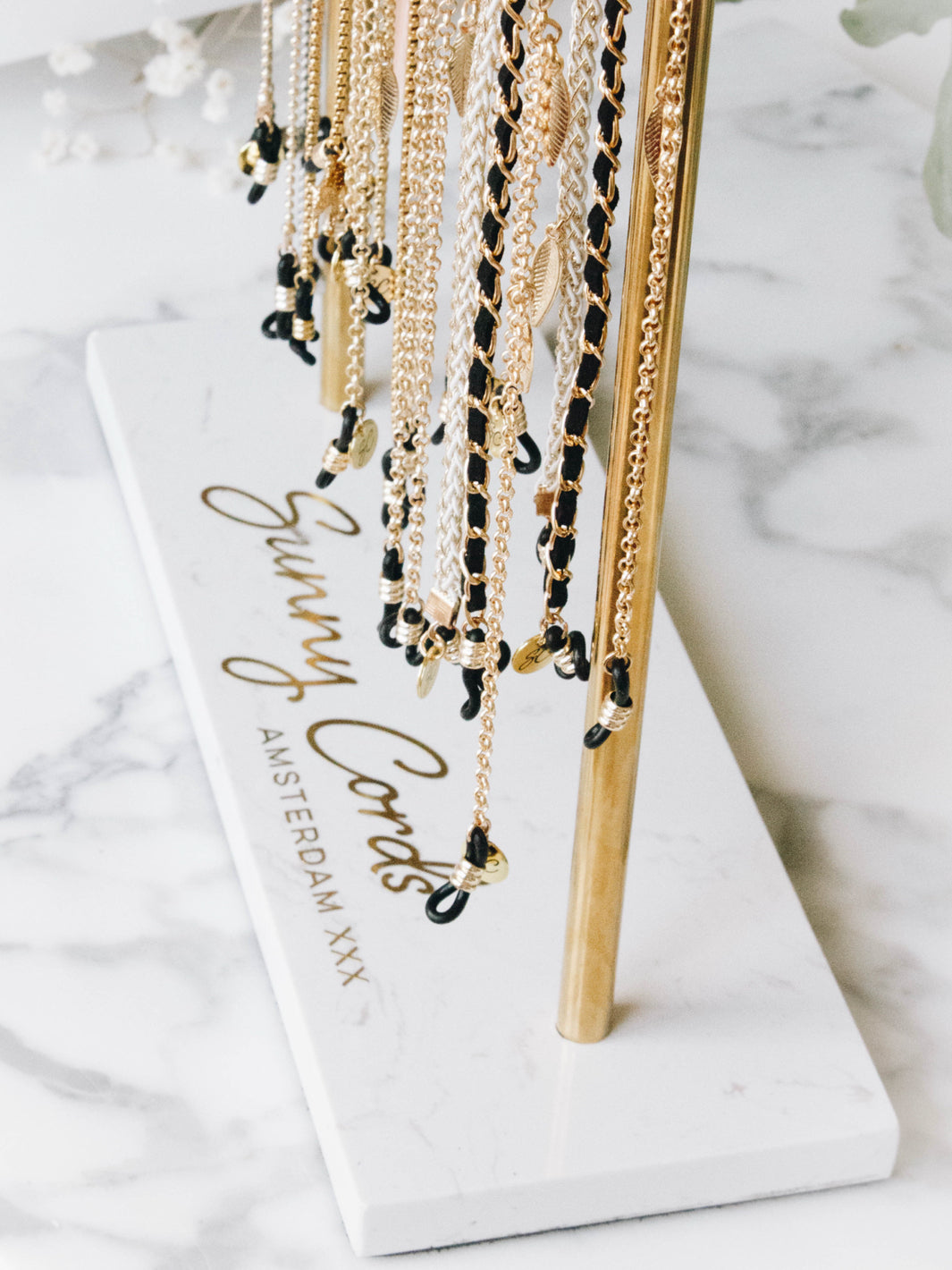 This display stand is sophisticated in design and made from gold metal and with a marble stone base. There is plenty of height to hang and store your sunglasses chains. It is super sturdy and gives your Sunny Cords the extra touch to be sold.