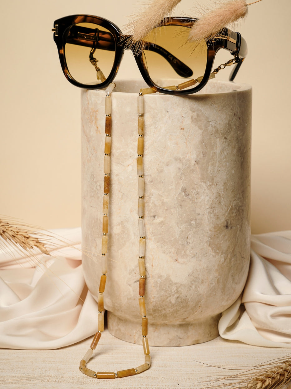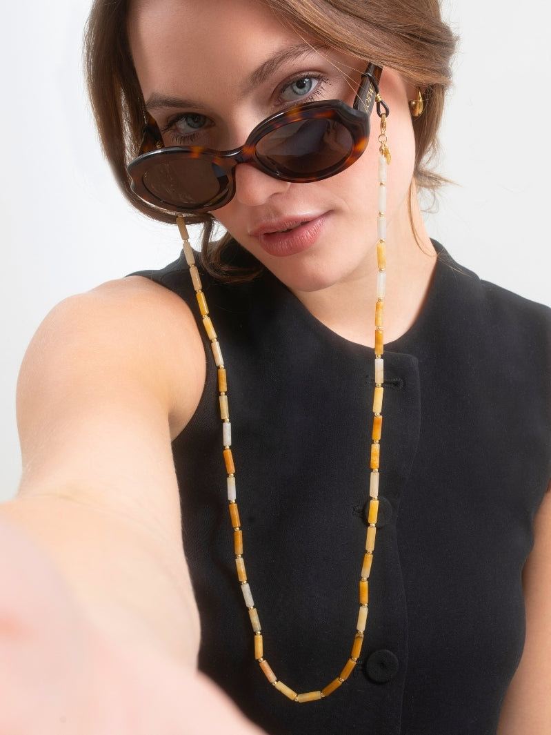 Bring natural elegance to your style with the Wendy glasses chain. Combining smooth natural cones, discs, and DQ gold beads, Wendy exudes effortless charm with soft beige tones. It’s a delicate statement for those who love organic textures and golden accents — the perfect sunglass chain for understated sophistication.